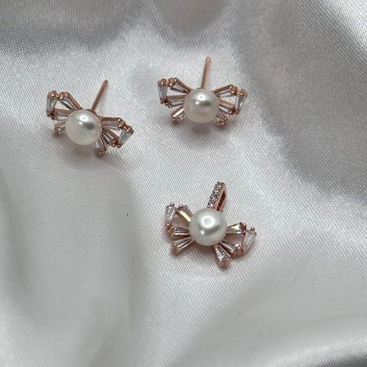 Pearl and Baguette Crystal Bow Rose Gold Pendant Set